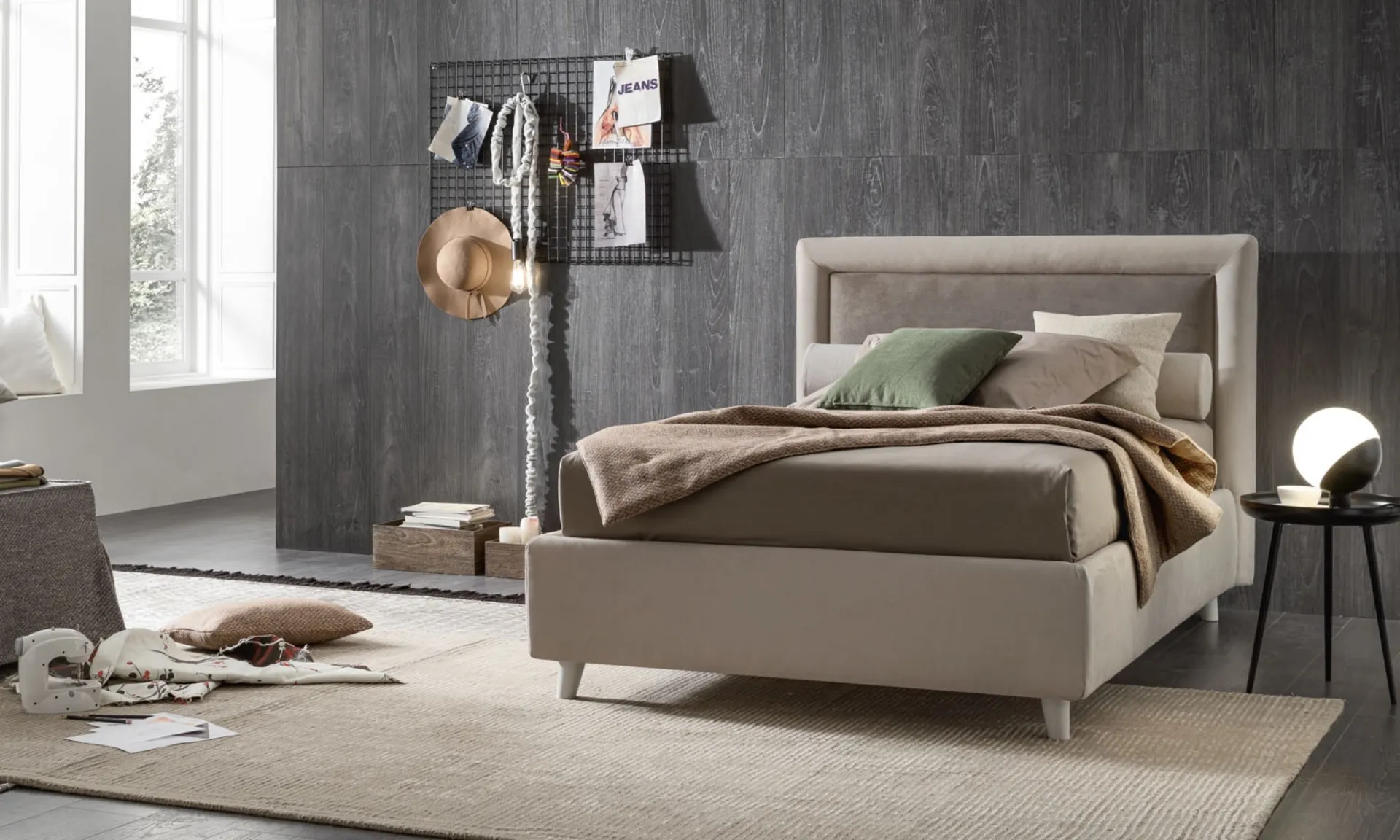 Il letto singolo Chloe in tessuto nella fotografia, tra i modelli imbottiti moderni di V&Nice, è perfetto per garantire il sonno più profondo.